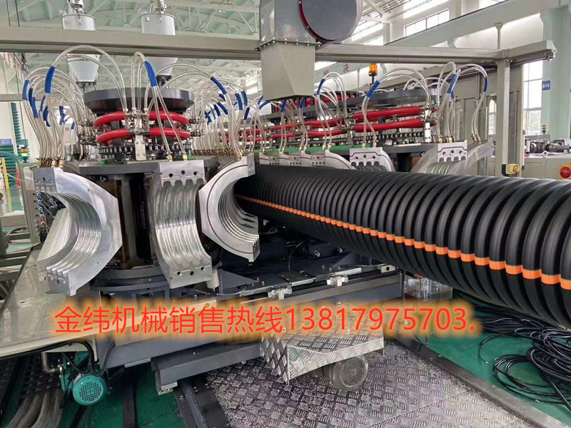 金緯臥式機主要生產PE(聚乙烯)、PP(聚丙烯)兩種材質的波紋管,由擠出機、擠出模具、成型機、噴淋槽、牽引機、切割機、堆放機、電控系統等部分組成。