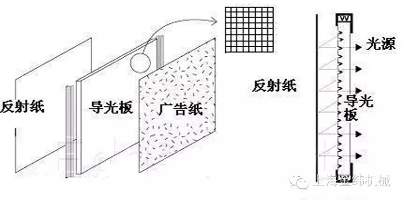 導光板的原理:當光線射到各個導光點時,反射光會往各個角度擴散,然后破壞反射條件由導光板正面射出。通過各種疏密、大小不一的導光點,可使導光板均勻發光。反射片的用途在于將底面露出的光反射回導光板中,用來提高光的使用效率。